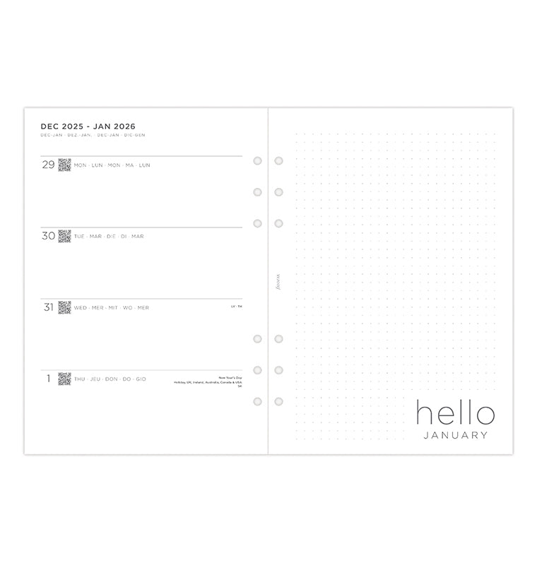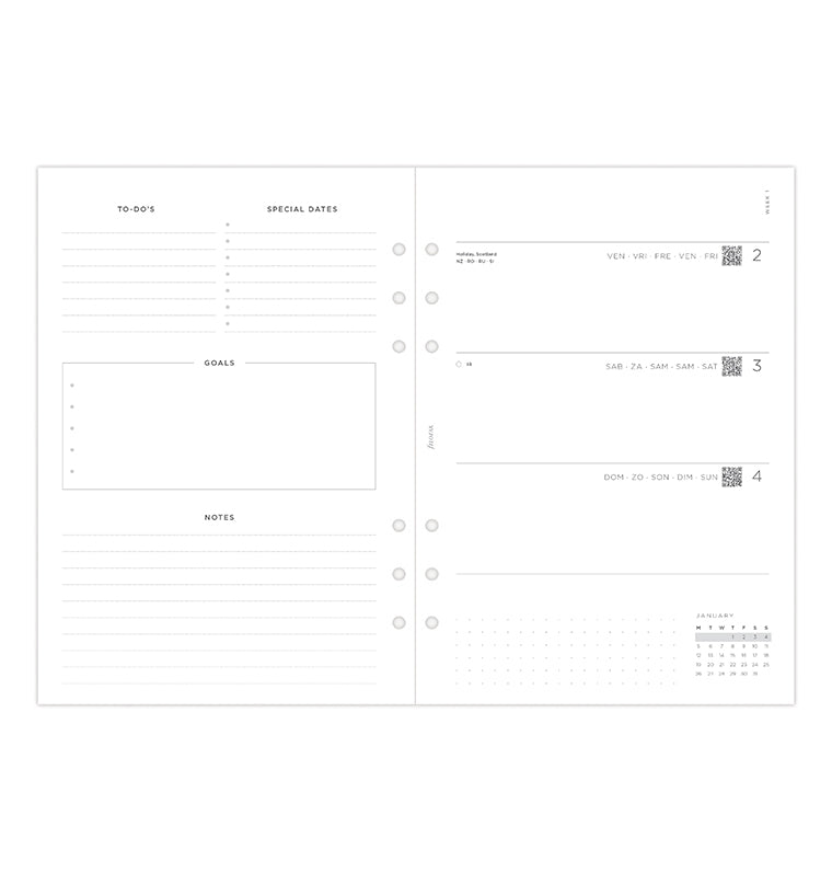 Ajoutez une touche personnelle à vos plans avec notre recharge Minimal. Cette recharge A5 contemporaine offre une mise en page horizontale de type "une semaine sur deux pages" et des pages blanches unies pour une organisation sans fin. Elle comporte une page "appartient à" conçue pour ajouter une touche personnelle. Les calendriers de l'année en cours et de l'année prochaine sont inclus pour vous permettre de planifier à l'avance, tandis que les pages du tableau de bord convivial invitent au début d'un nouveau mois. Découvrez la section "Grands projets" avec des pages en pointillés pour les objectifs mensuels. À la fin de l’agenda, vous trouverez également des pages en pointillés et lignées, parfaites pour vos notes et gribouillages. Multilingue. Papier adapté au stylo-plume.
