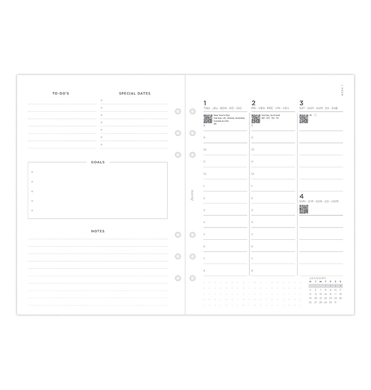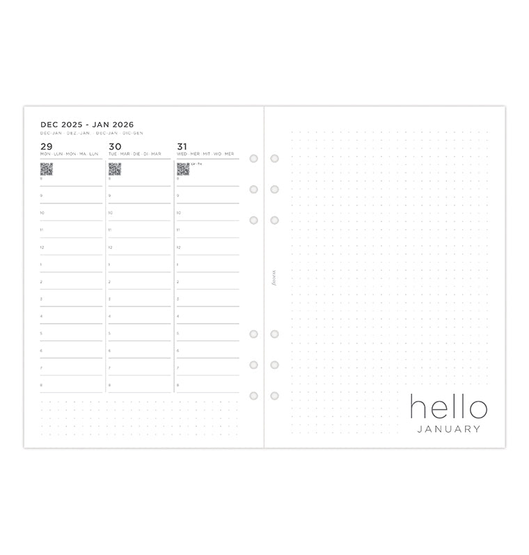 Ajoutez une touche personnelle à vos plans avec notre recharge Minimal. Cette recharge A5 contemporaine offre une mise en page verticale de type "une semaine sur deux pages" et des pages blanches unies pour une organisation sans fin. Elle comporte une page "appartient à" conçue pour ajouter une touche personnelle. Les calendriers de l'année en cours et de l'année prochaine sont inclus pour vous permettre de planifier à l'avance, tandis que les pages du tableau de bord convivial invitent au début d'un nouveau mois. Découvrez la section "Grands projets" avec des pages en pointillés pour les objectifs mensuels. À la fin de l’agenda, vous trouverez également des pages en pointillés et lignées, parfaites pour vos notes et gribouillages. Multilingue. Papier adapté au stylo-plume.