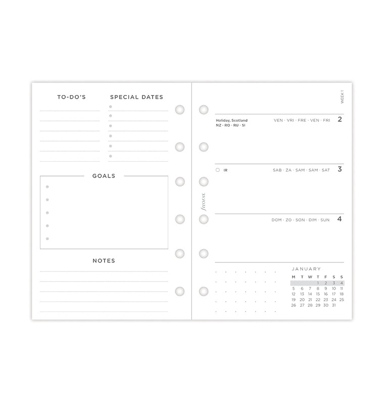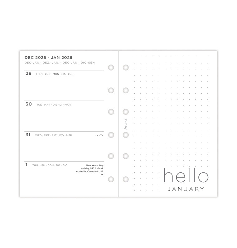 Ajoutez une touche personnelle à vos plans avec notre recharge Minimal. Cette recharge Pocket contemporaine offre une mise en page horizontale de type "une semaine sur deux pages" et des pages blanches unies pour une organisation sans fin. Elle comporte une page "appartient à" conçue pour ajouter une touche personnelle. Les calendriers de l'année en cours et de l'année prochaine sont inclus pour vous permettre de planifier à l'avance, tandis que les pages du tableau de bord convivial invitent au début d'un nouveau mois. Découvrez la section "Grands projets" avec des pages en pointillés pour les objectifs mensuels. À la fin de l’agenda, vous trouverez également des pages en pointillés et lignées, parfaites pour vos notes et gribouillages. Multilingue. Papier adapté au stylo-plume.