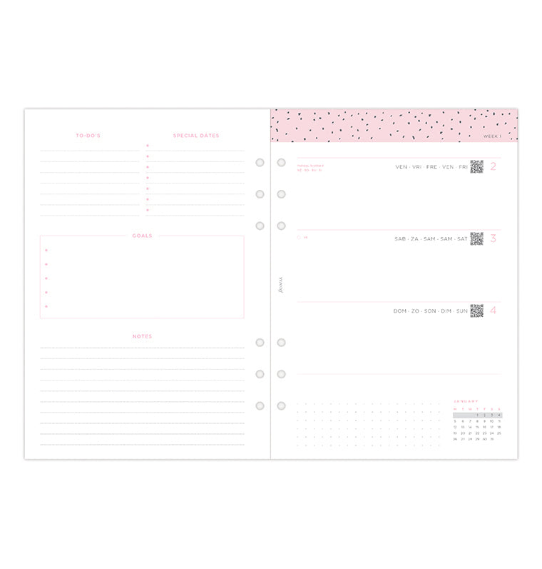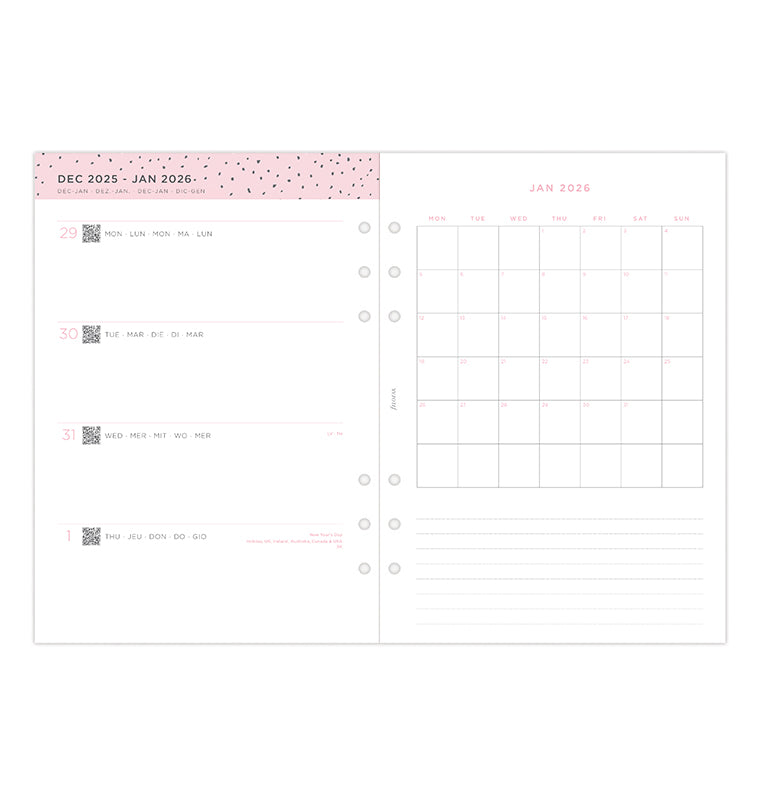 Plan in stijl met onze 2026 vulling uit de Confetti Collectie. Deze prachtige A5 vulling biedt een horizontale week tot week indeling met leuke design details roze en houtskool kleuren. Voorzien van een "Hoort bij" pagina ontworpen voor het toevoegen van een persoonlijke touch. Kalenders van het huidige en het volgende jaar zijn opgenomen om u de kans te geven vooruit te plannen, terwijl de vriendelijke dashboard pagina's uitnodigen tot het begin van een nieuwe maand. Ontdek het gedeelte "Grote plannen" met stippelpagina's voor maandelijkse doelen. Aan het einde van de agenda vindt u ook gestippelde en gelijnde pagina's, perfect voor uw notities en doodles. Meertalig. Vulpenvriendelijk papier.